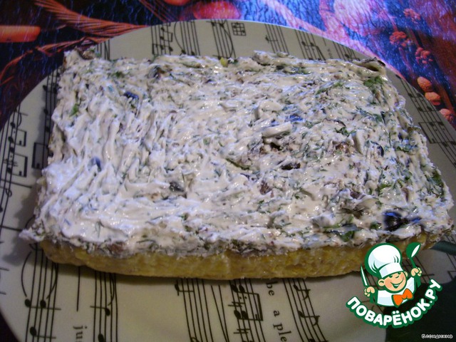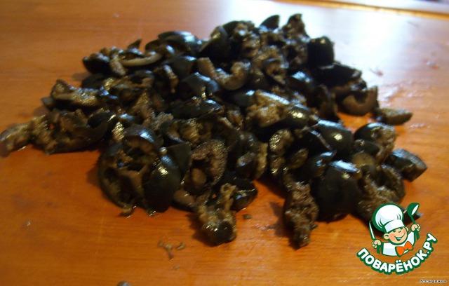 Тем временем готовим «начинку». Маслины порезать на кусочки (не очень мелкие)