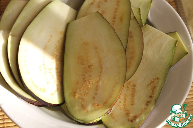 Баклажаны нарезать тонкими ломтиками, залить подсоленной водой, оставить на 30 минут