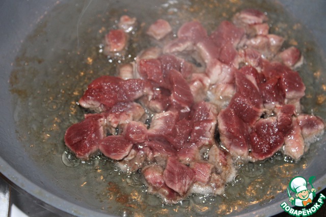 Баранину мелко нарезать, обжарить на растительном масле. Для себя я делала без мяса. Было тоже очень вкусно)))