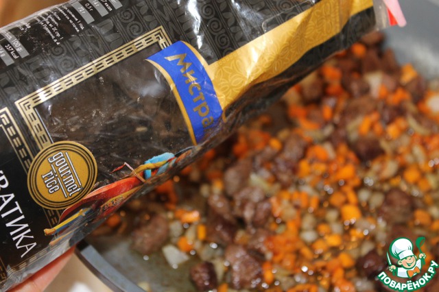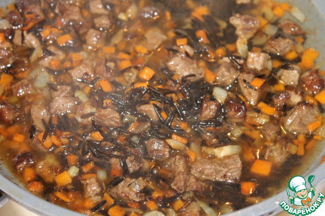 Чуть потушить, добавить дикий рис, и пожарить 10 минут.