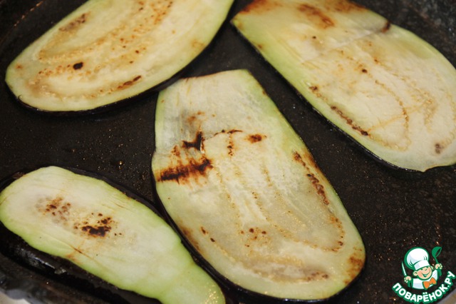 Тем временем баклажаны отжать, обсушить и слегка обжарить на растительном масле. Выложить на салфетку для удаления лишнего жира