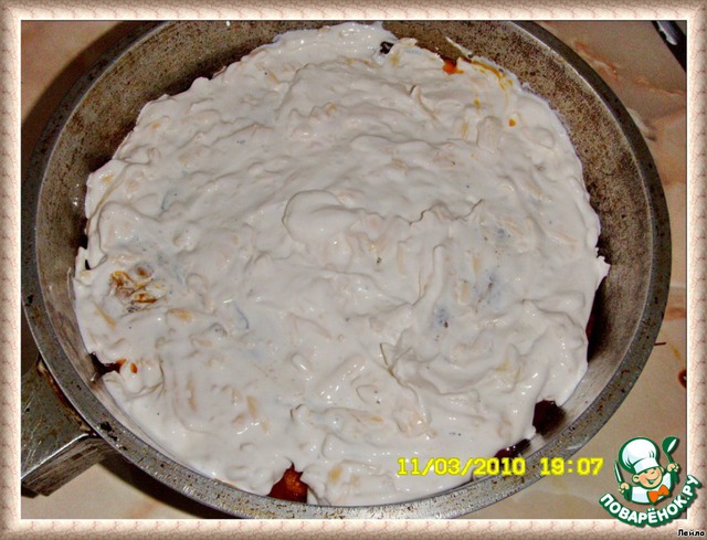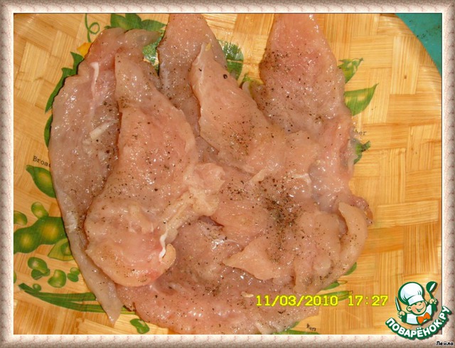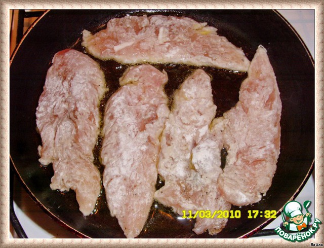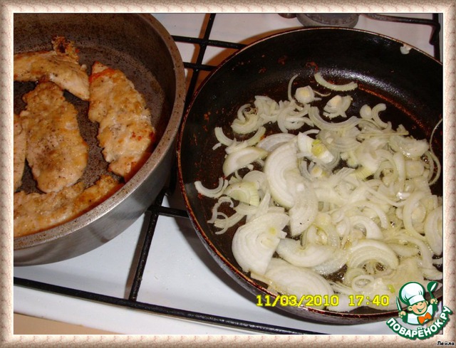 [i]По рецепту (я делала без бекона).[/i][quote]Бекон обжарить и выложить поверх шницелей (по полоске бекона на каждый). [/quote] В жире, оставшемся от бекона, обжарить мелко порезанный лук,