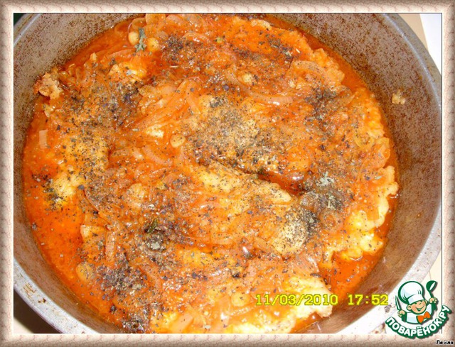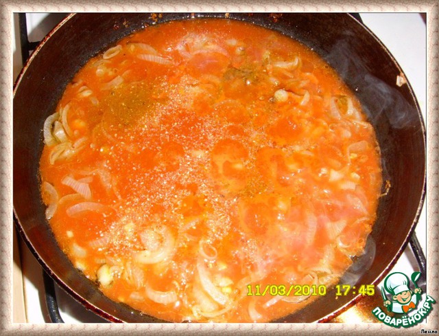 добавить томатный соус [i](вместо соуса - 100 мл. воды + 2 ст. л. томат. пасты)[/i] и [i]вино[/i](или шампанское). Проварить и