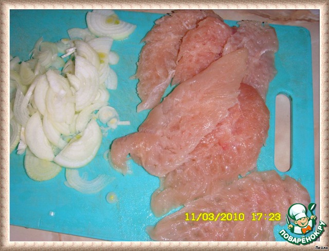 Куриные грудки [i](грудинки у нас готовые, разрезанные на кусочки)[/i] промыть и обсушить бумажным полотенцем. Разрезать иx вдоль пополам и слегка отбить. Отбивать любое мясо удобно, уложив его между двумя листами пищевой пленки. Нарезать лук.