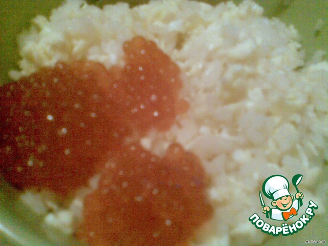 5. Соединяем сначала рис с яйцами..хорошо перемешиваем, потом добавляем икру и перемешиваем ещё раз, аккуратно ..