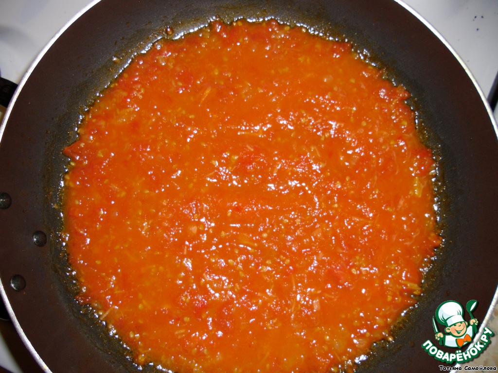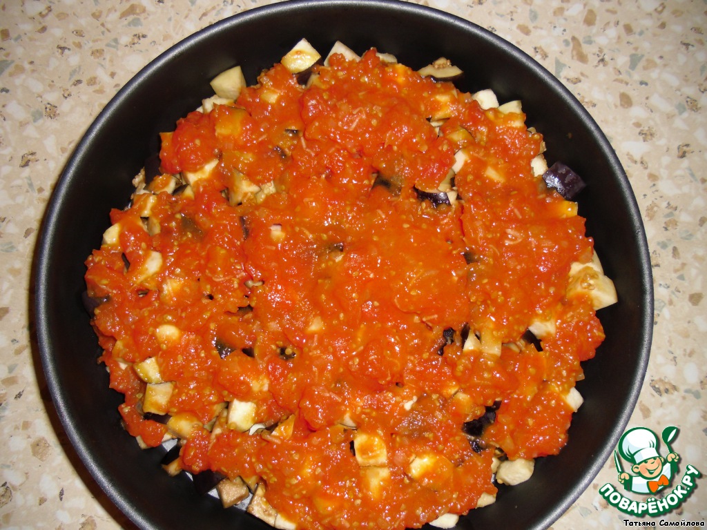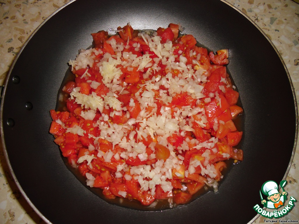 Баклажаны порезать кружочками, натереть солью и оставить на 10-15 минут. Помидоры очистить от кожицы, мелко порезать, положить на сковороду, добавив мелко порезанный лук и натертый на терке чеснок.