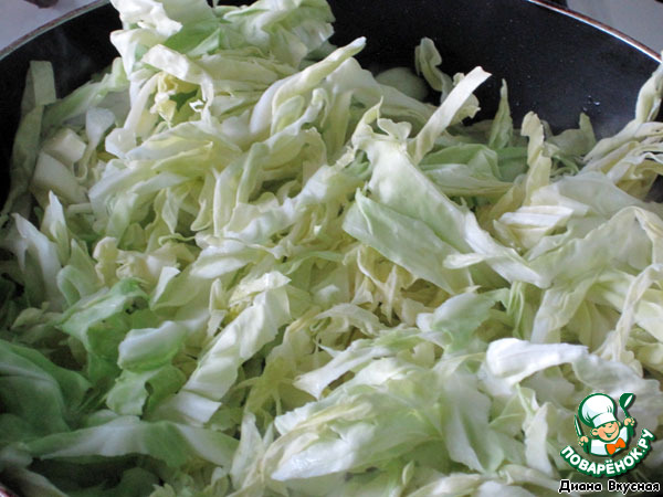 когда лук обжарится, добавить нашинкованную молодую капустку и не тушим, а именно недолго поджариваем (чтоб хрустела)