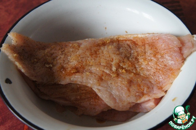 Мясо поперчить, посыпать приправой и измельченным чесноком.