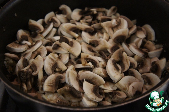 Шампиньоны почистить и нарезать тонкими пластинками. Несколько красивых ломтиков отложить для сервировки блюда.