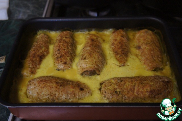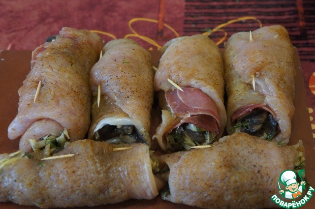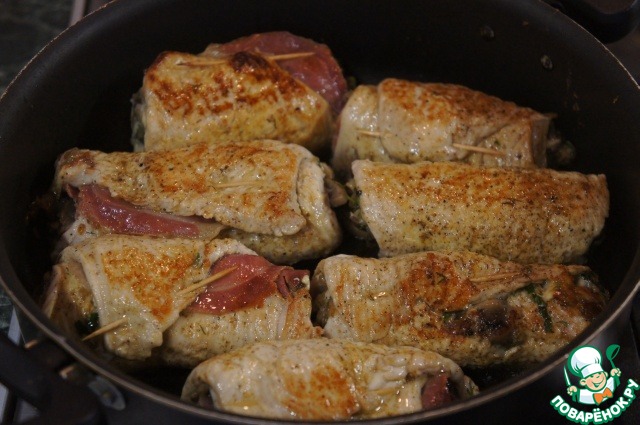 Аккуратно извлечь зубочистки и выложить в форму для запекания швом вниз. Поставить форму в горячую духовку, запекать 20 минут.