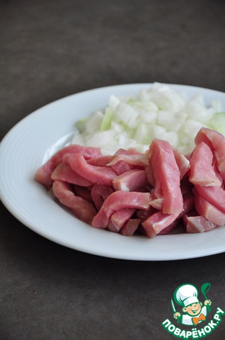 Нарезать свинину тонкими полосками или кубиком. Лук нарезать мелко.