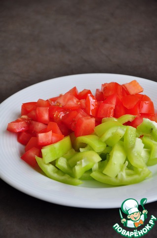 Перец болгарский полосками, помидор кубиком, чеснок порубить. Все продукты нужно кратко обжаривать в сковороде. Они должны остаться целыми кусочками.
