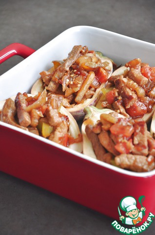 Баклажаны смазать со всех сторон оливковым маслом. Выложить в форму для запекания. Каждую баклажанную чашечку нафаршировать приготовленными овощами с мясом, полить подливой. Запекать в предварительно разогретой духовке при 180* - 30-40 минут.
