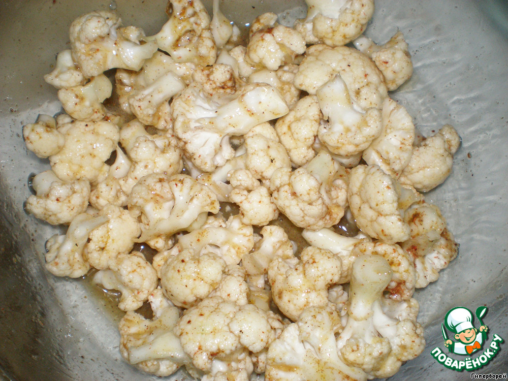 Цветную капусту разобрать на соцветия. Добавить специи, яйцо, посолить и перемешать.