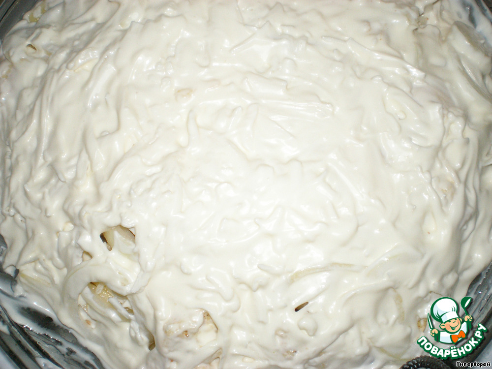 Поверх капусты выложить нарезанный кольцами лук, сверху присыпать натертым сыром и смазать все это добро майонезом.