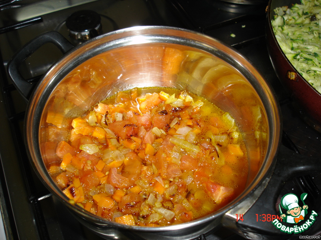 Типичное итальянское блюдо, в котором используют различные овощи и сыр. Лук ,морковь, чеснок нарезаем и обжариваем на масле.