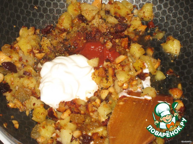 Добавить к орехам изюм, ананас, мед, соль, все хорошо перемешать, прогреть 2-3 минуты.