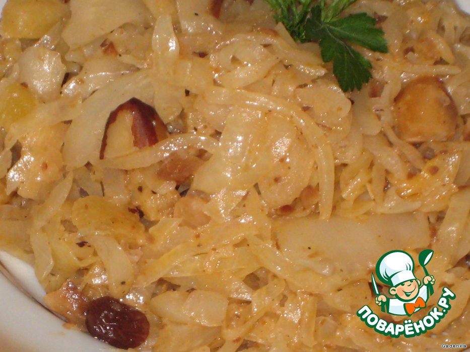 | Для любителей тушеной капусты и сочетаний кисло-сладко-остренького. Очень своеобразная капустка, но на мой вкус, к сожалению чужого мнения сказать не могу, делала для себя. Капусту я обожаю в любом виде, а тут получается сочетание тушеной капусты с кисло-сладким ананасом и сладким изюмом, очень ароматно, за счет мягкого бразильского ореха и имбиря и немножко остренько, из-за перчиков, я такое очень люблю. Очень неплохой гарнир к рыбке или курочке. |