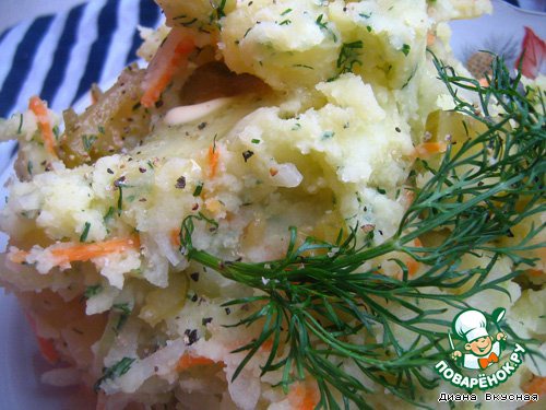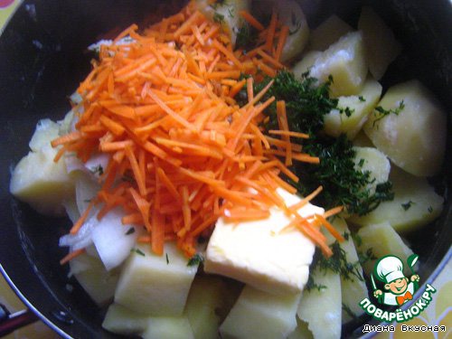 когда картофель сварится, слить всю жидкость и в горячий картофель засыпать все заготовки плюс около 50-70 граммов масла, можно по желанию и больше.Поперчить, посолить, перемешать всё и немного примять - только не до состояния пюре