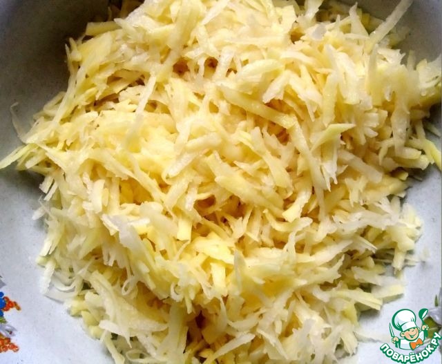 Приступить к выпечке картофельных блинов. Картофель натереть на крупной терке длинной соломкой, обязательно промыть и хорошо отжать.