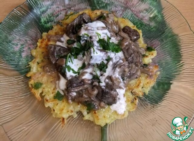 Печень с грибами на картофельной тарелке