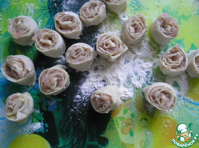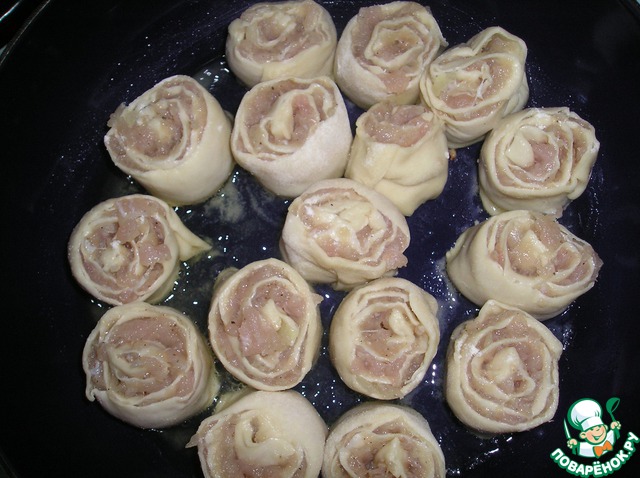 Раскатаем тесто в длинный прямоугольник, потоньше, но не до дыр, размажем равномерно фарш, свернем в рулетик и нарежем штруделей. Пусть пока отдохнут на посыпанной мукой поверхности.