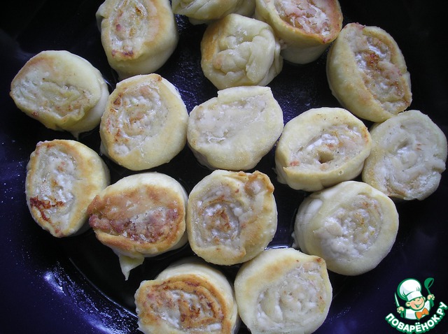 В сотейник, нальем на дно оливковое масло, разогреем и выложим наши штрудели в один слой. Обжарим.