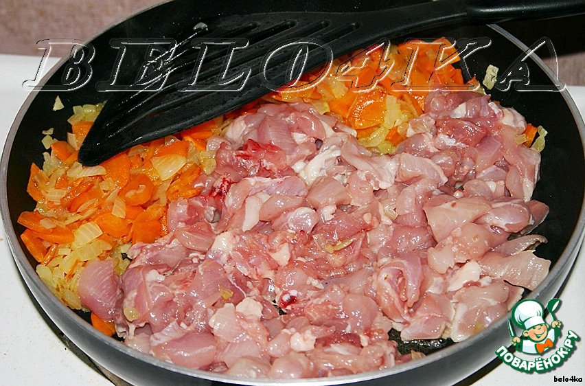 добавить куриное филе (предварительно нарезанное маленькими кусочками), жарить, помешивая, 5 минут.
