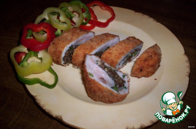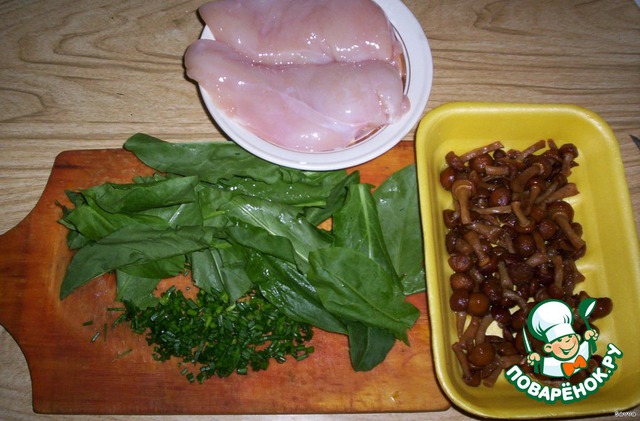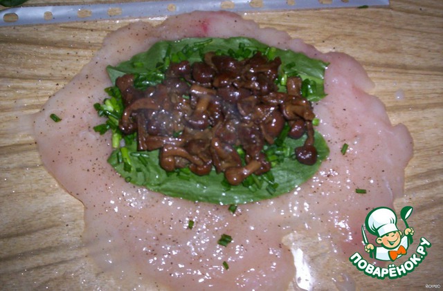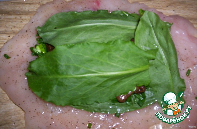 - филе посолить, поперчит, выложить на филе листья щавеля+мелко порезанный лук+грибы