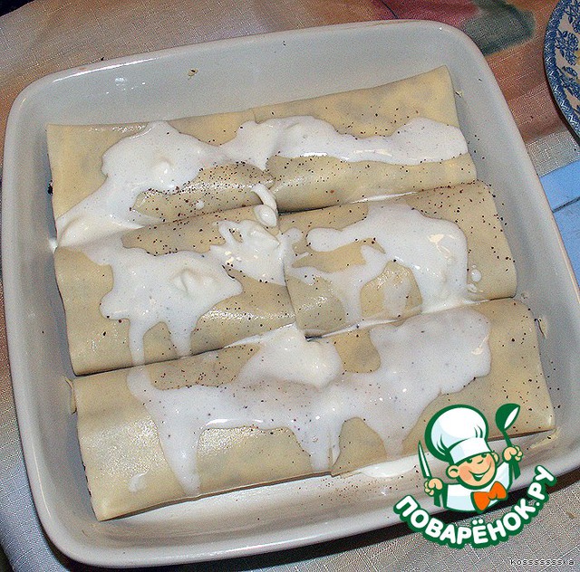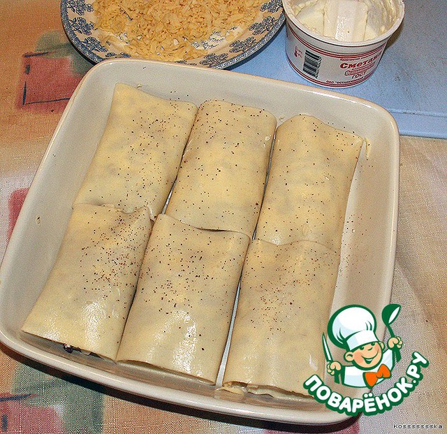 Поливаем остатками сметаны (не сильно, чтоб не плавали потом в соусе). Главное, чтобы края рулетиков были намазаны сметаной, а то потом твердые сухие будут.
