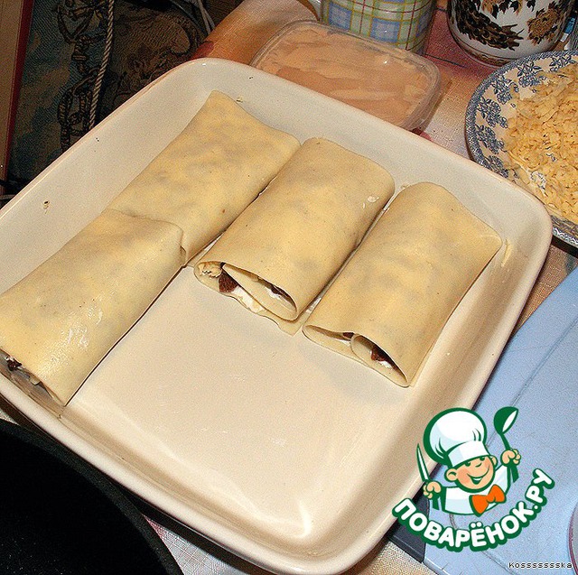 Аккуратно заворачиваем (не туго) наше изделие в рулетик, укладываем в смазанную сливочным маслом форму. Так же укладываем плотнее друг к другу и остальные рулетики.