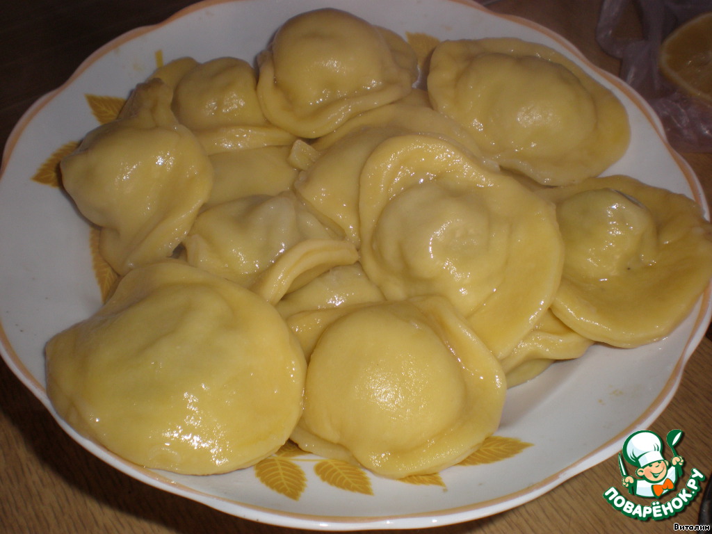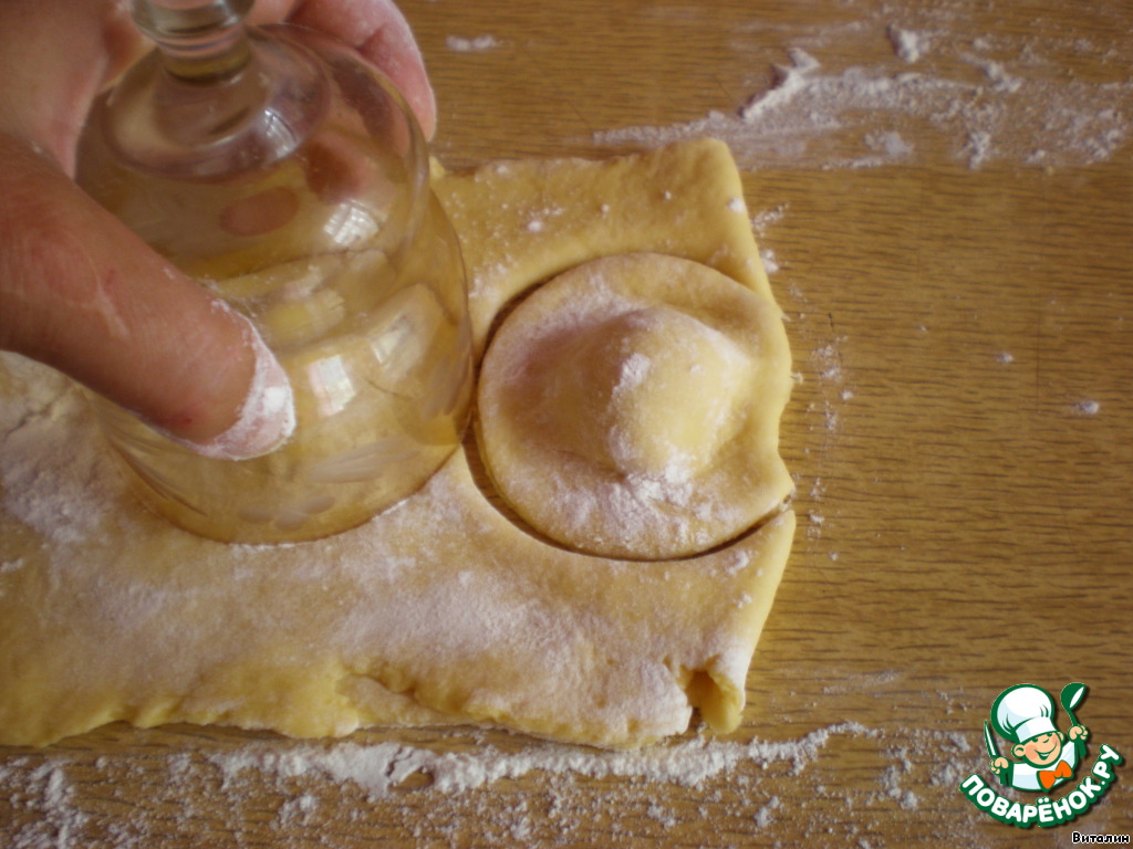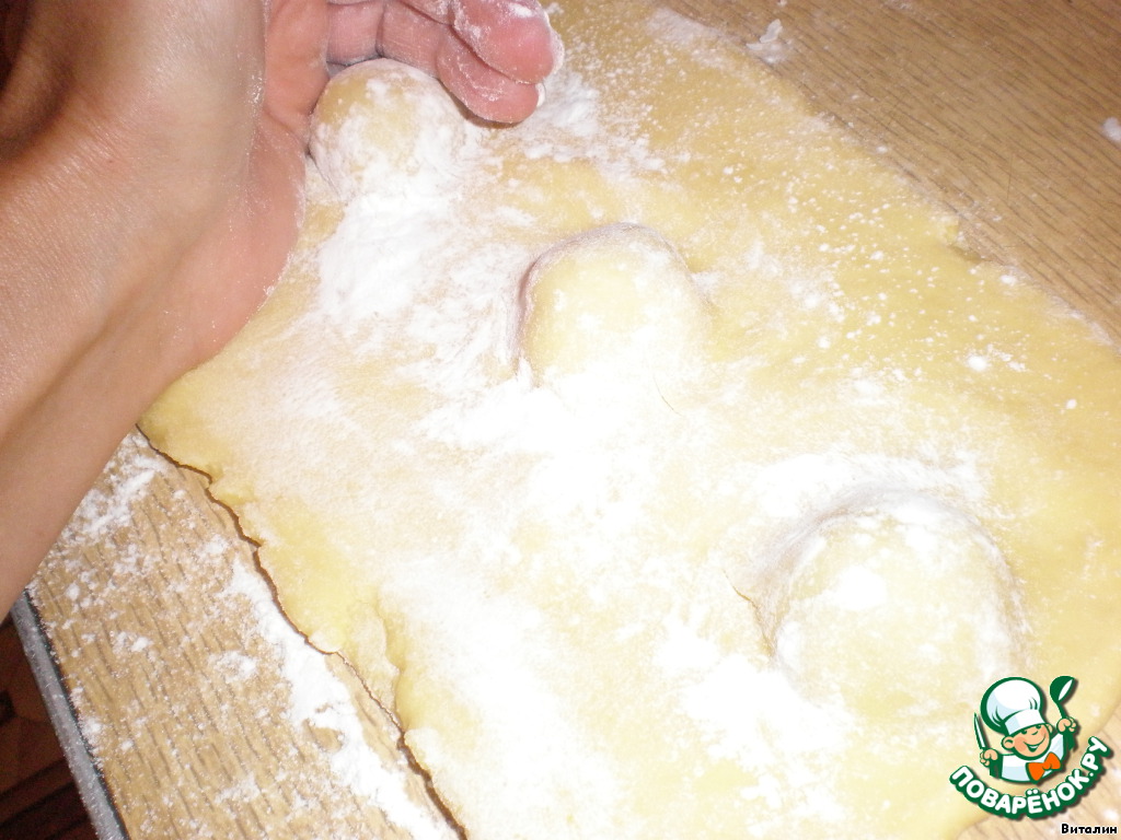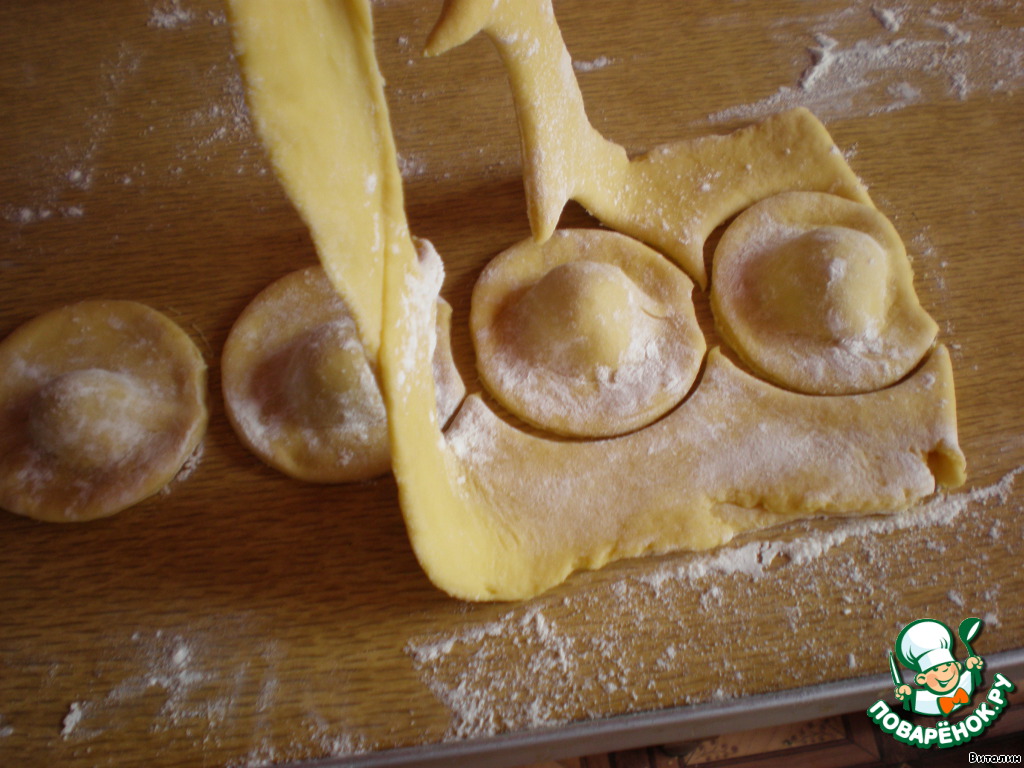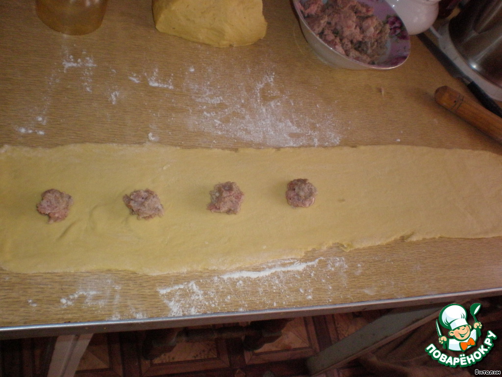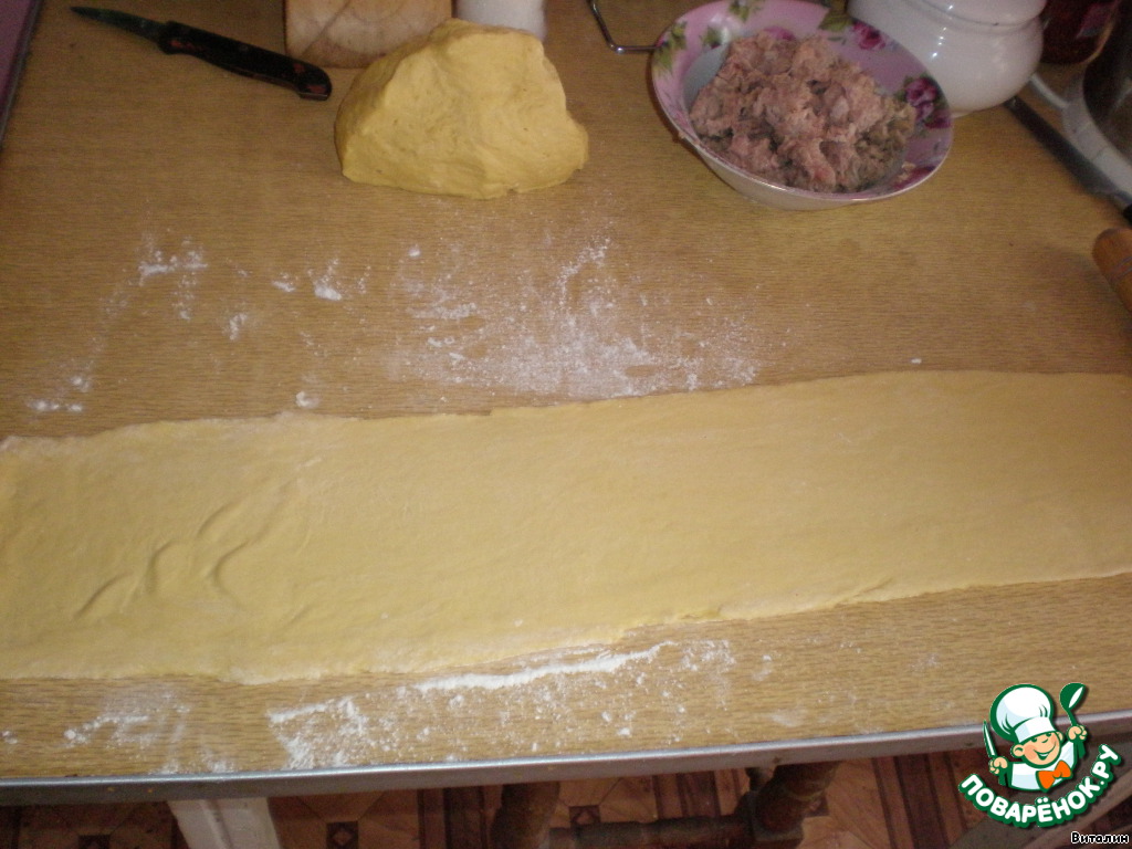 Затем я делаю так: раскатываю скалкой длинную, тонкую и узкую полоску, фарш (как на пельмени) уже готов.