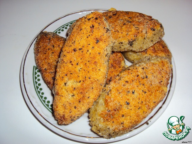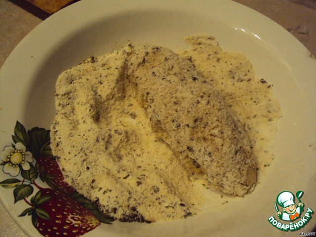 Приготовить панировку: смешать манку, муку, сушёный базилик и карри.