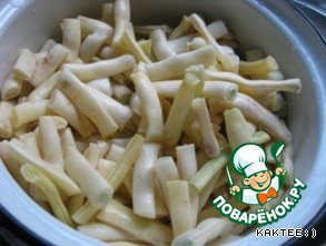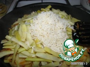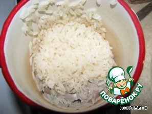 Потом всыпаем фасоль (часть воды в которой варилась фасоль влить в стакан) и рис.