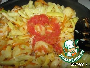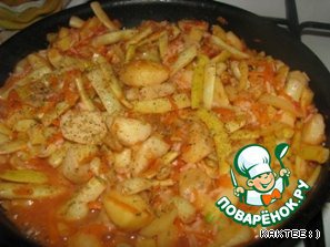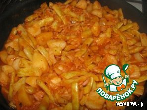 Жарим-пожарим и добавляем воду которая осталась от фасоли. Накрываем крышкой и тушим мин 15-20. Пробуем и приправляем солью и перцем по вкусу:)