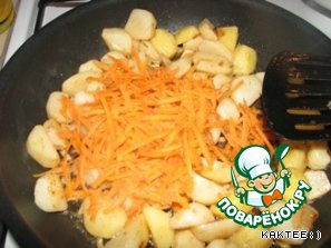 Добавляем отварной картофель и морковь. Жарим:) немного солим и перчим,добавляем приправы для картофеля.