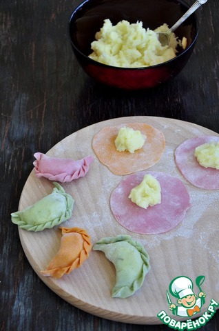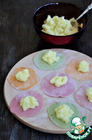 Присыпая стол мукой, раскатать тесто в виде колбаски, нарезать ее на кусочки толщиной 2см. Раскатать из них кружочки, выложить на каждый кружочек чайную ложку картофельного пюре.