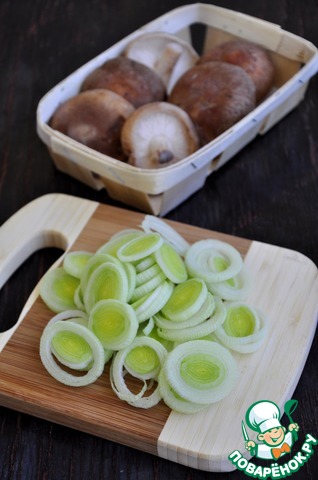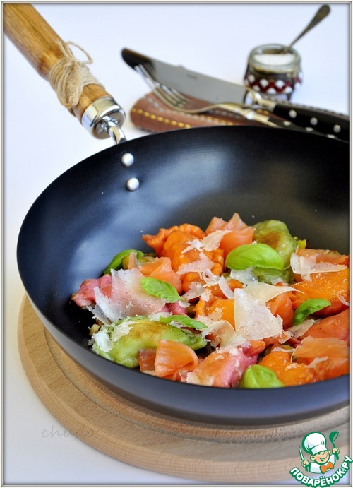 При подаче выложить вместе с варениками и грибами очищенную, нарезанную малосольную сельдь (у меня был кусочек лосося) и посыпать рубленой зеленью. Я еще посыпала тертым пармезаном.