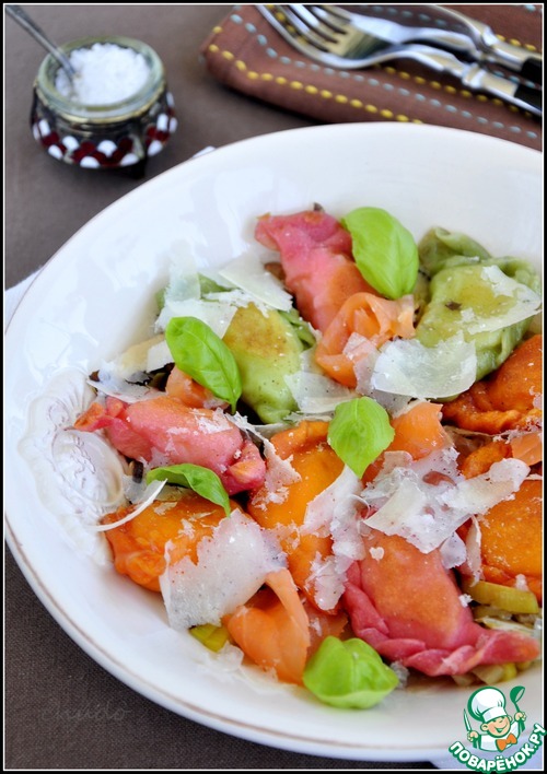 Из просеянной муки, воды, соли, масла и яйца замесить тесто. Разделить тесто на три части. Из свеклы, моркови и шпината выдавить сок. Добавить в тесто. Подсыпая муку, замесить эластичное тесто. Накрыть тесто пищевой пленкой, дать ему отдохнуть несколько минут.