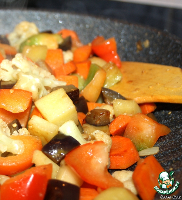 В отдельной сковороде разогрейте оставшееся масло и обжарьте овощную смесь 5-7 минут.