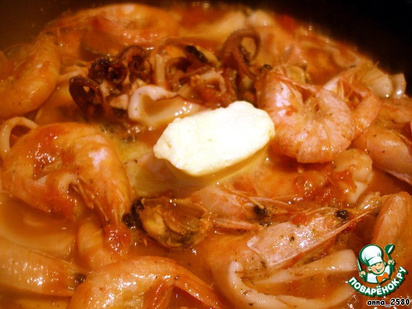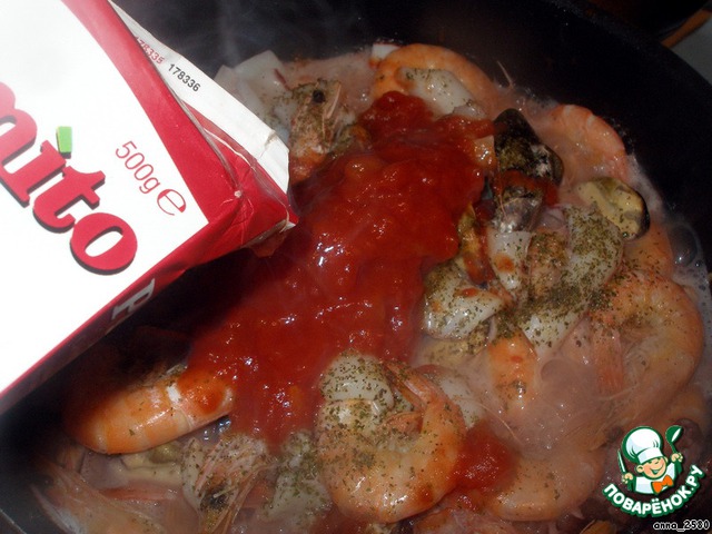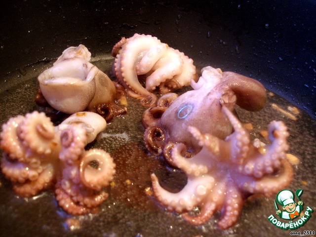 Теперь морепродукты. Первыми идут те, что дольше готовятся. В моем случае это осьминоги. Если у вас есть закрытые раковины, то сначала отправте в сотейник их, подождите пока откроются. Те, что не открылись - смело выбрасывайте! Одна такая ракушка может испортить все блюдо! К осьминогам добавляем нарезанную на небольшие кусочки рыбу (у меня филе трески).