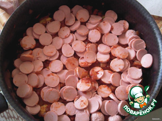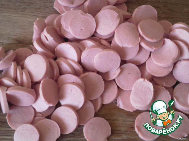 Сосиски режем кружочками. Без них обойтись можно, просто часто мужчины без мясного овощи не едят (в моем случае так и происходит).