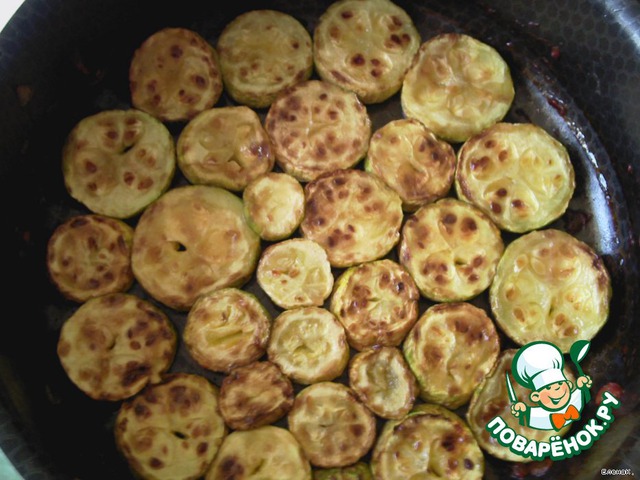 В сотейник плотно выкладываем слой кабачков.
