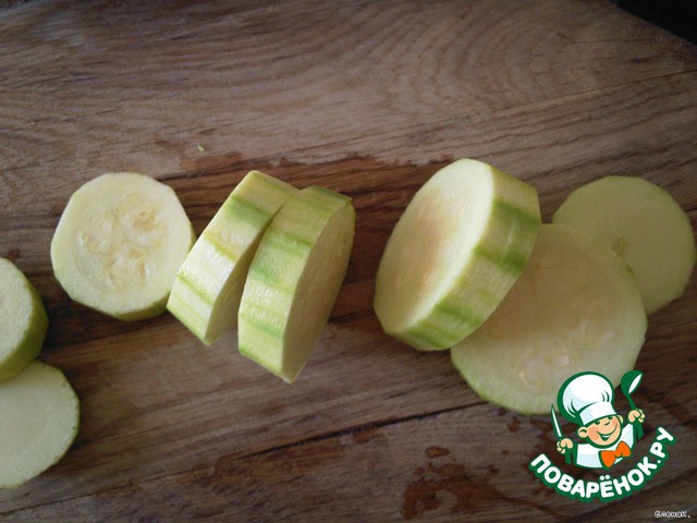 Кабачки моем, чистим, нарезаем толстенькими кружочками, солим.