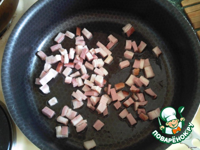 Грудинку мелко режем и обжариваем. На мой взгляд, что-нибудь копчененькое класть обязательно.