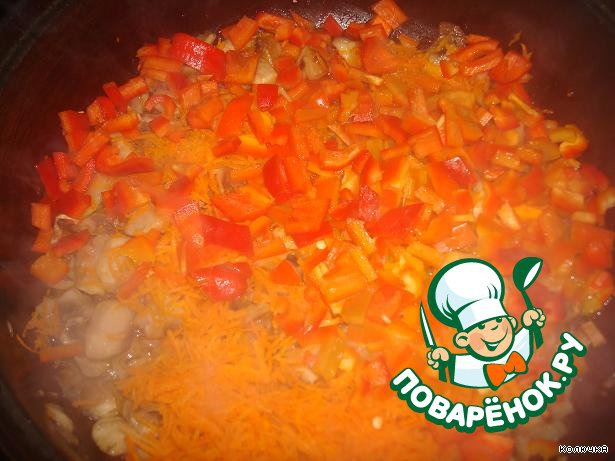 К грибочкам добавила перчик и морковку, и тоже обжарила.