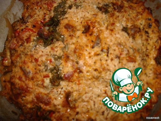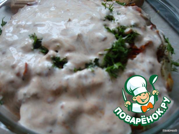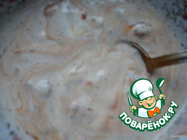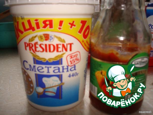 Затем делаем заливку. Я брала сметанку и соус лечо.