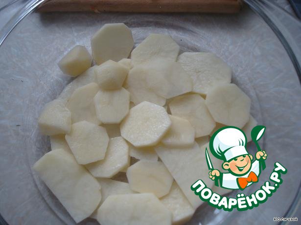 На дно посуды выкладываю слой картошечки, посыпаю ее базиликом.