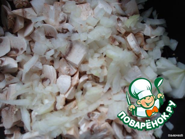 Я брала шампиньоны, помыла их и мелко порезала. К ним добавила мелко порезанную луковку и обжарила на сковородке.