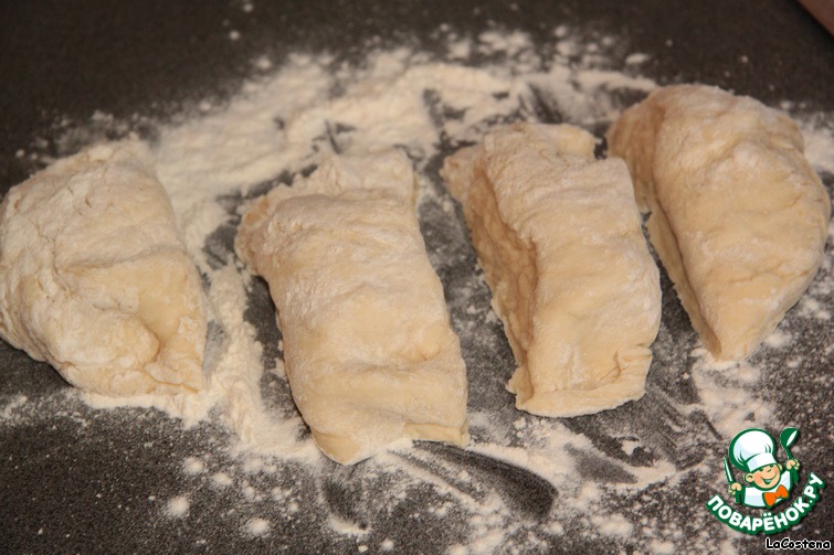 Наше тесто разделить на 4 части. В моем случае это связано с использованием пельменницы.